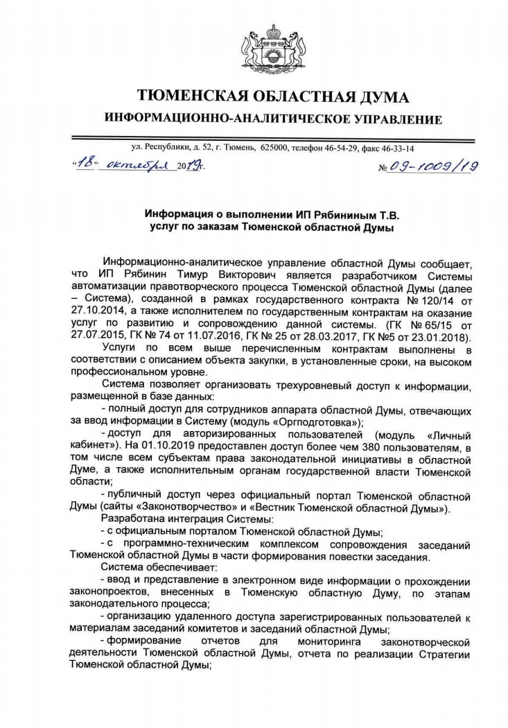 На 01.10.2019 предоставлен доступ более чем 380 пользователям, в том числе всем субъектам права законодательной инициативы в областной Думе, а также исполнительным органам государственной власти Тюменской области.