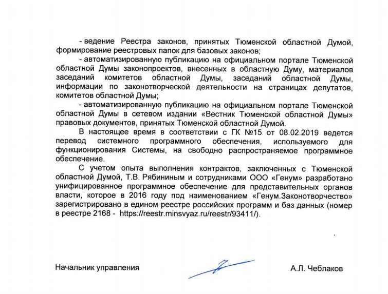 Работа осуществлялась в тесном контакте представителей обеих сторон. Исполнитель продемонстрировал заинтересованность в конечном результате, адаптивность под потребности Заказчика и глубоки знания, как в области разработки информационных систем, так и в досточно специфической предметной области - законотворческом процессе.