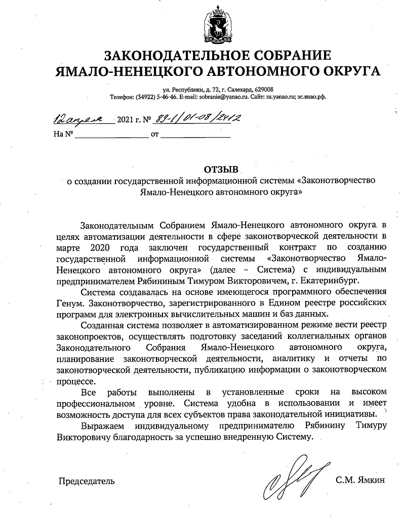 Созданная система позволяет в автоматизированном режиме вести реестр законопроектов, осуществлять подготовку заседаний коллегиальных органов ЗС ЯНАО, планирование законотворческой деятельности, аналитику и отчеты по законотворческой деятельности, отчеты, публикацию информации о законотворческом процессе. Система удобна в использовании и имеет возможность доступа для всех субъектов права законодательной инициативы. Выражаем благодарность за успешно внедренную систему.