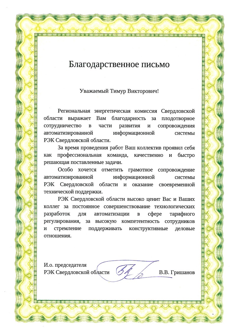 Особо хочется отметить грамотное сопровождение автоматизированной информационной системы РЭК Свердловской области и оказание своевременной технической поддержки. РЭК Свердловской области высоко ценит Вас и Ваших коллег за постоянное совершенствование технологических разработок для автоматизации в сфере тарифного регулирования, за высокую компетентность сотрудников и стремление поддержать конструктивные деловые отношения.
